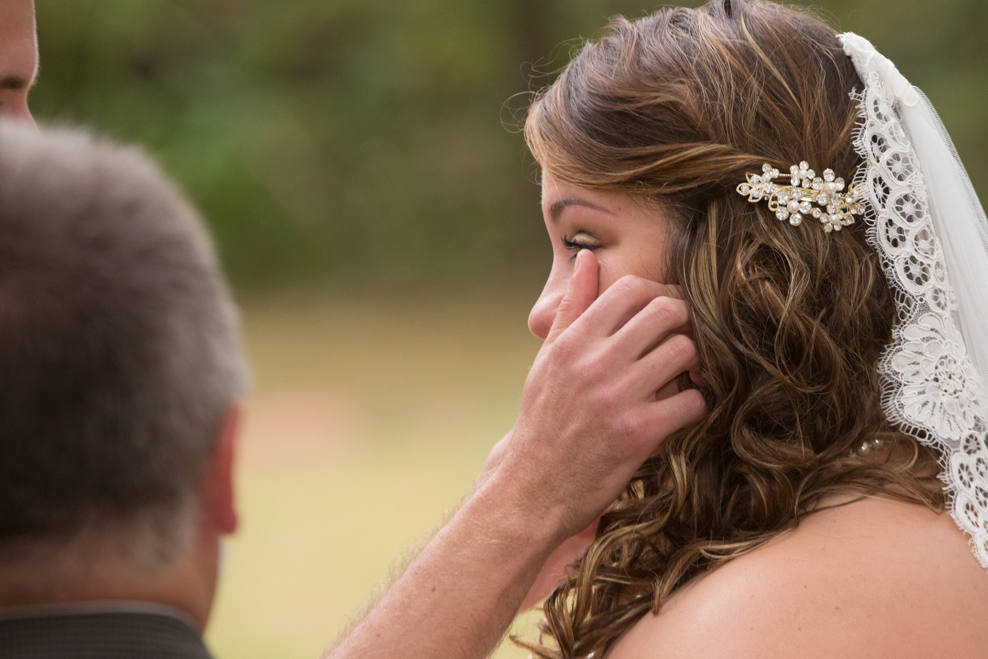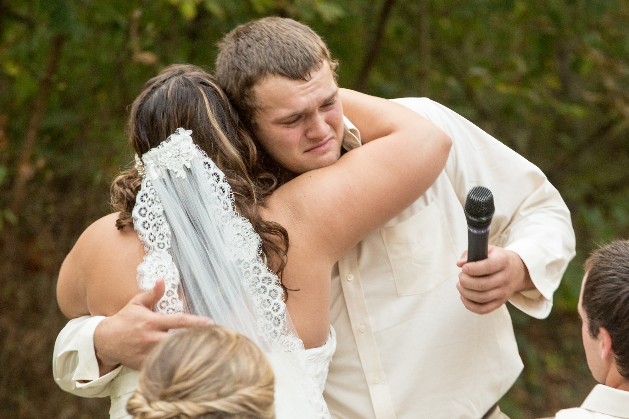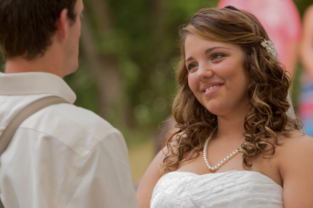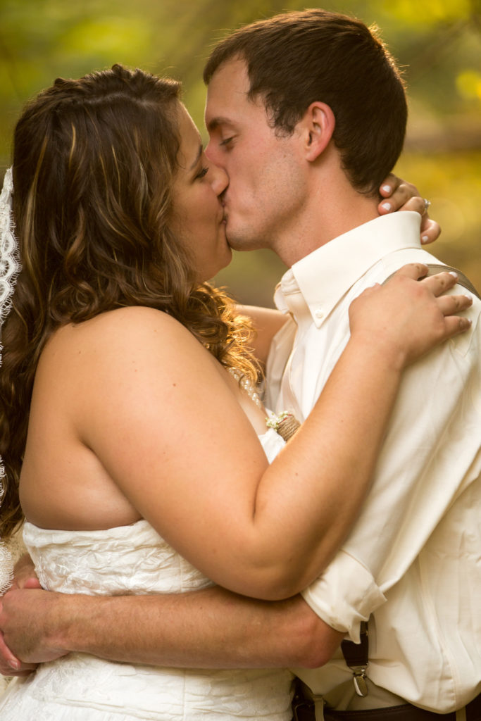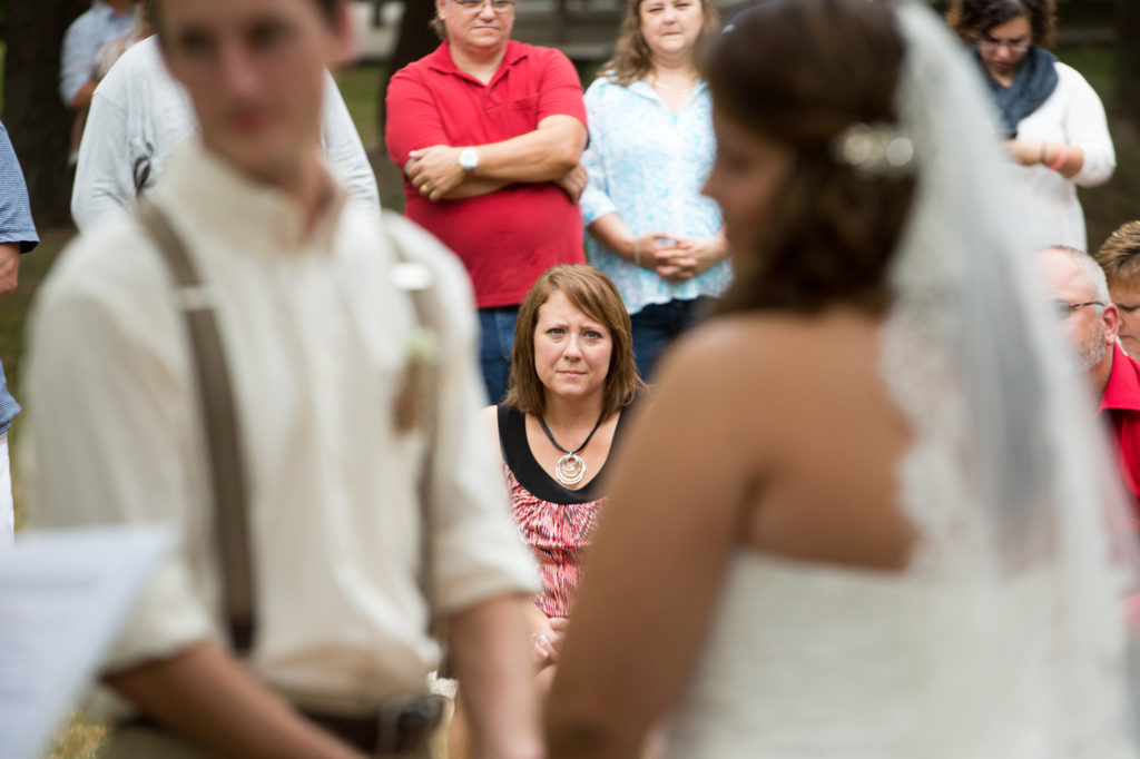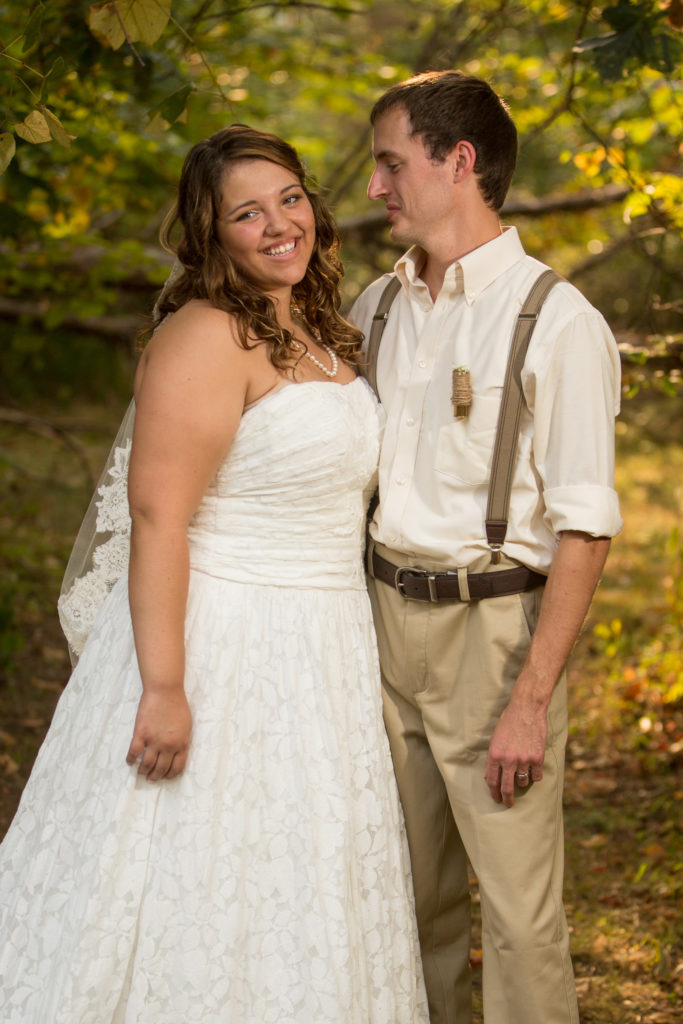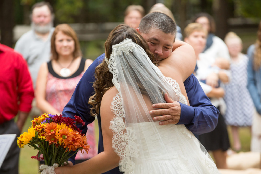 When the wedding started the groomsmen walked with the pastor down through the wooded area and met in front. Then came the flower girls and ring bearers.They had a little trouble, but for most weddings this is nothing more than one of the great memories. The bride was escorted to the front and the ceremony began. She looked beautiful and all went well during this wedding ceremony. The bride was emotional in a good way and as you will see in one of the photos, the groom even had to wipe away a tear.