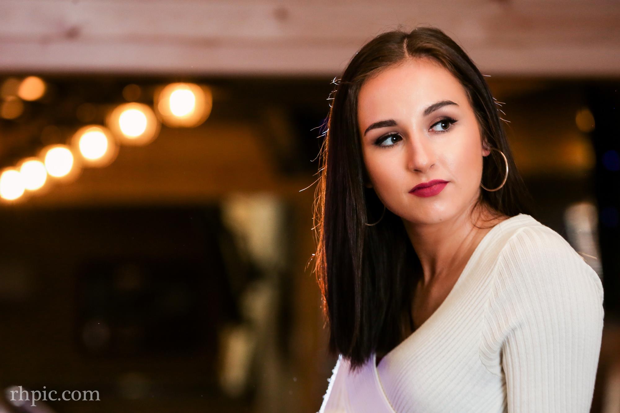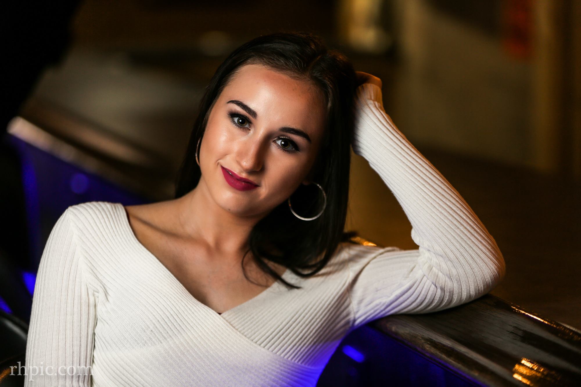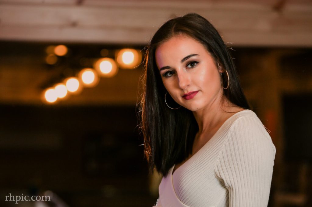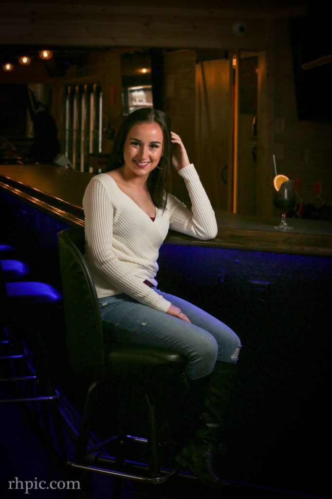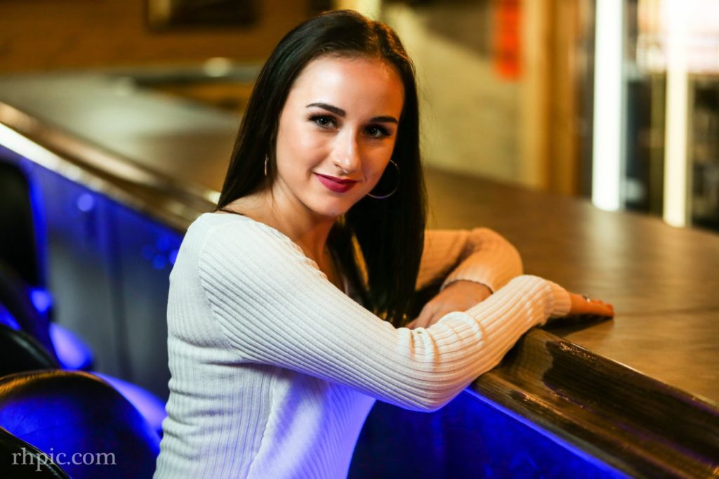 I like the color in these photos a lot. It was the first time I had been in the Village Tavern since it had been remodeled. The blue lights under the bar along with the orange in the wall really complimented each other. Pulling the blinds helped drop the overall lighting of the background and a flash or two made the model pop.