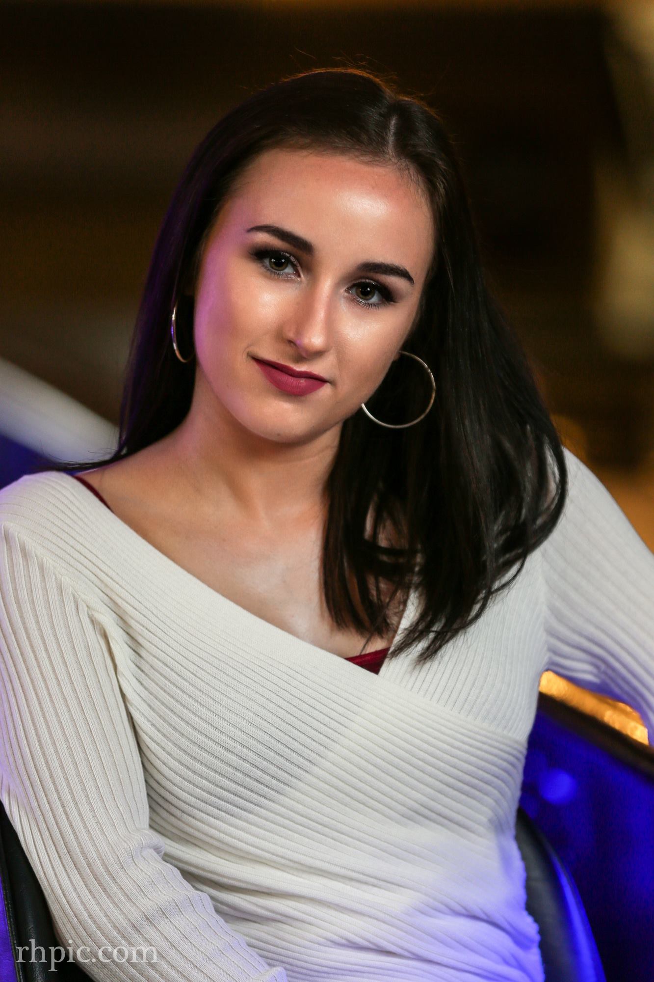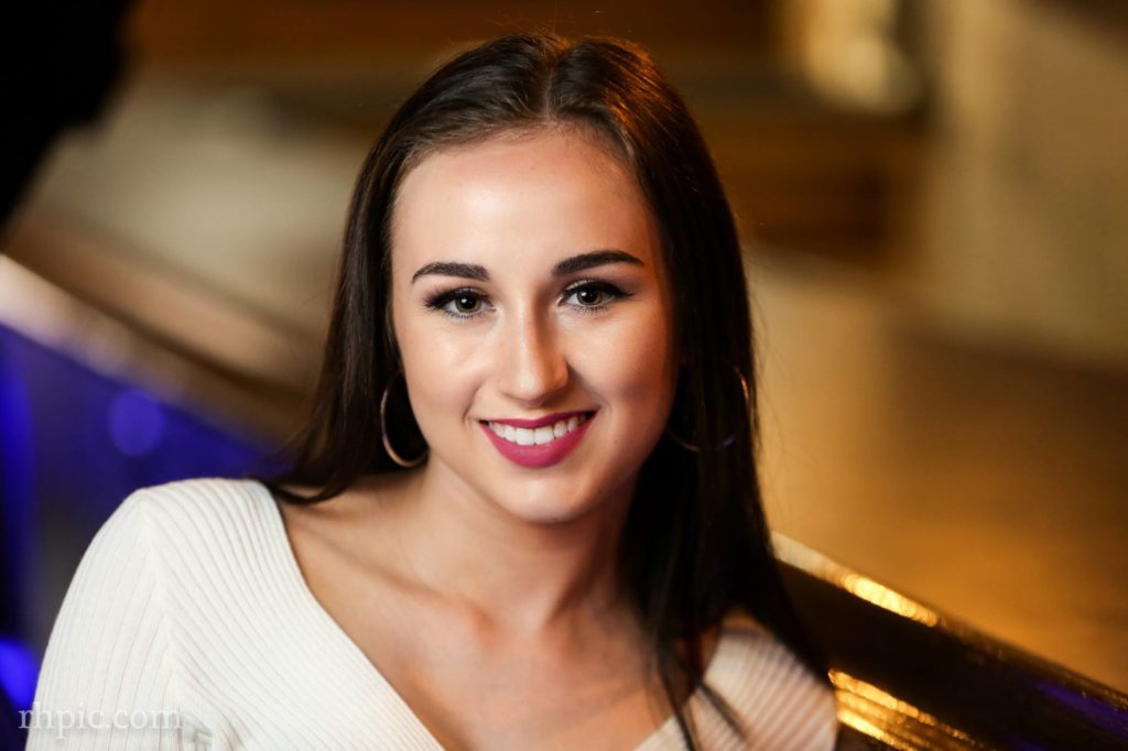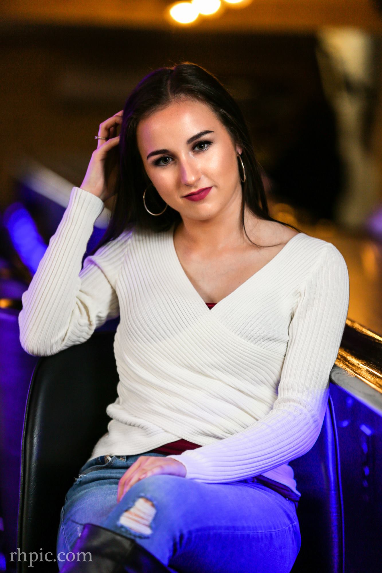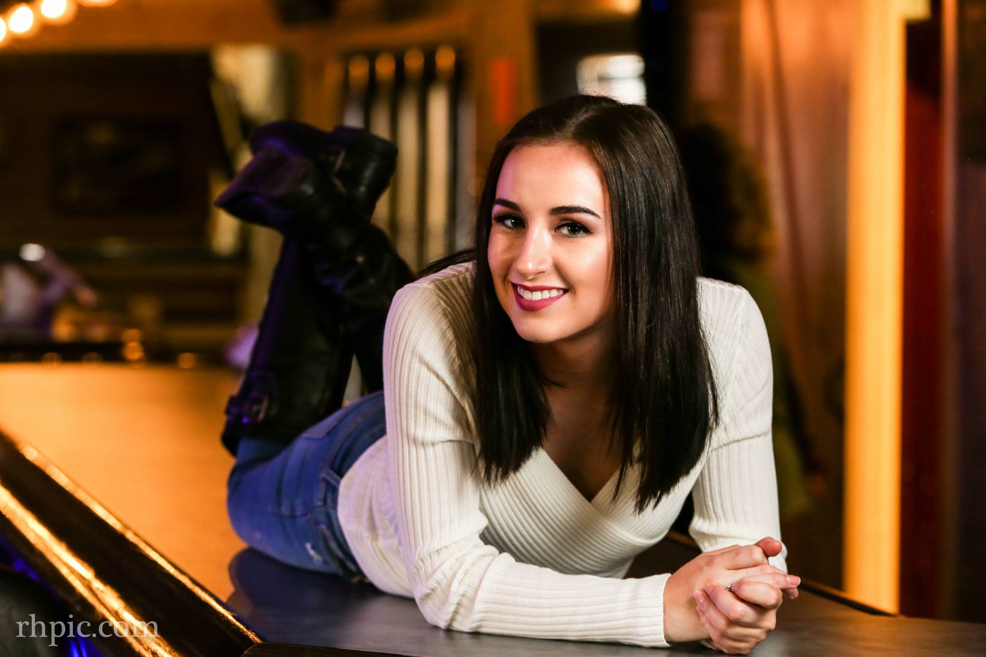 I like the color in these photos a lot. It was the first time I had been in the Village Tavern since it had been remodeled. The blue lights under the bar along with the orange in the wall really complimented each other. Pulling the blinds helped drop the overall lighting of the background and a flash or two made the model pop.