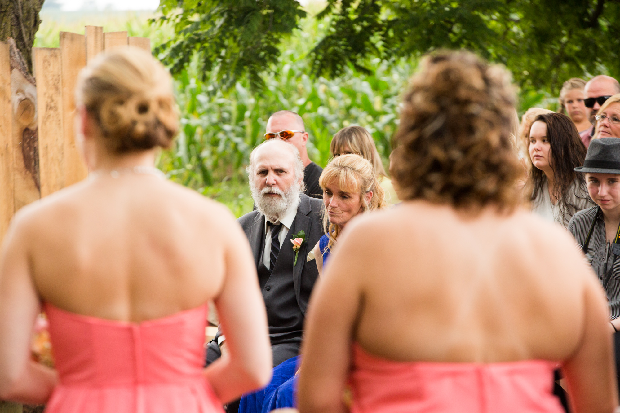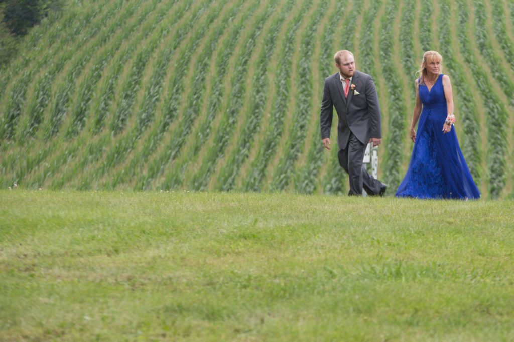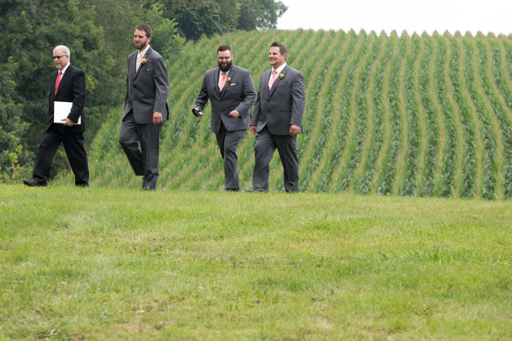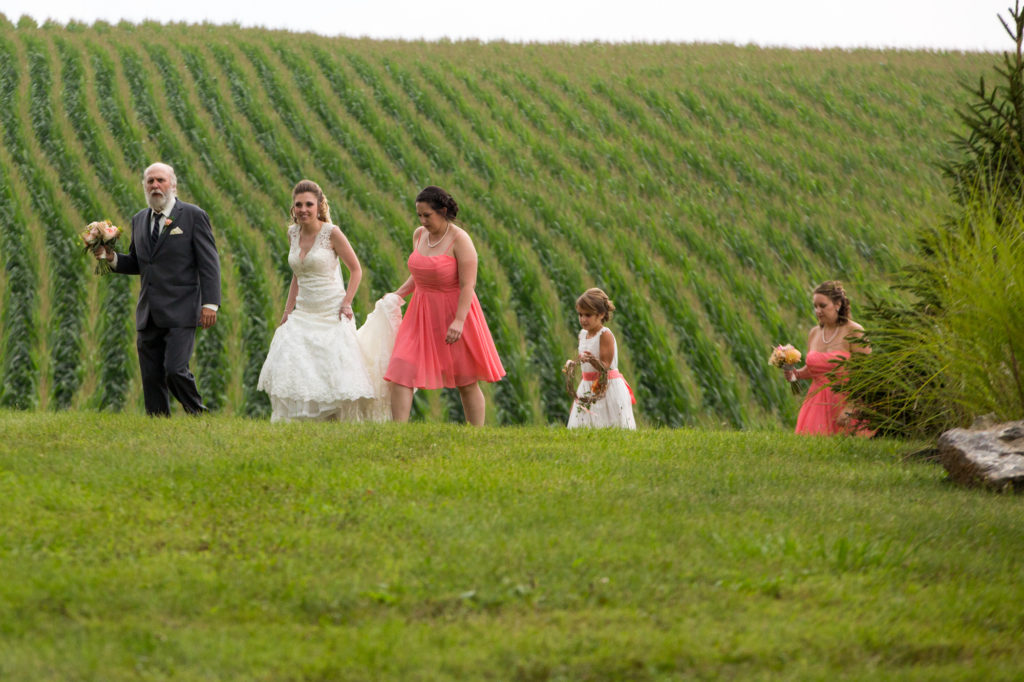 Th wedding party walked up a small hill with a cornfield in back of them which I thought made for a nice photo. I shot so there was grass in front, the wedding party and then the corn rows behind. When they reached their spot to walk down the isle a doorway had been made for them to walk through. There were two barrels with beautiful flowers set on either side of the door. When given the ok I started the songs for them to walk in to and also started shooting pictures.