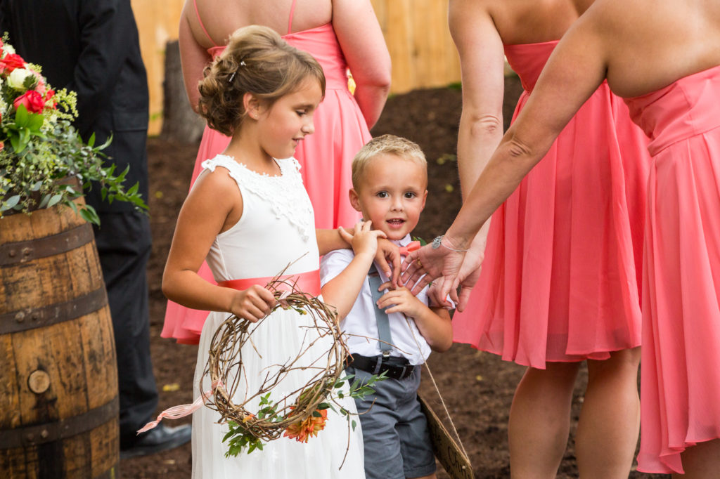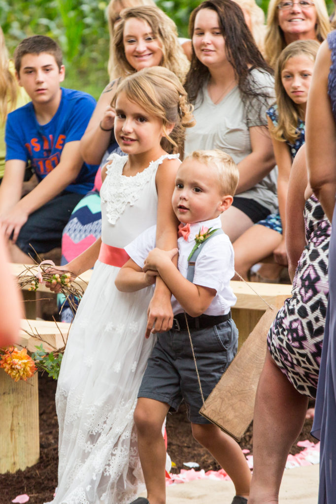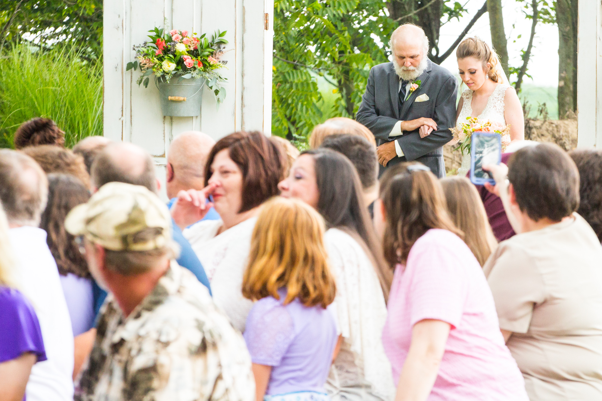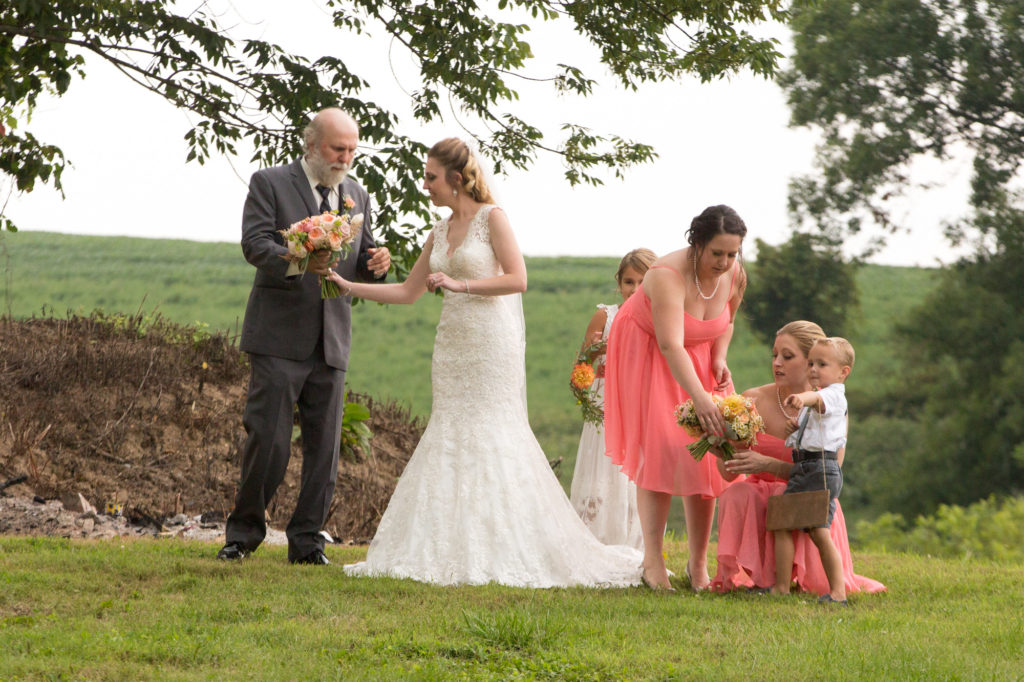 Th wedding party walked up a small hill with a cornfield in back of them which I thought made for a nice photo. I shot so there was grass in front, the wedding party and then the corn rows behind. When they reached their spot to walk down the isle a doorway had been made for them to walk through. There were two barrels with beautiful flowers set on either side of the door. When given the ok I started the songs for them to walk in to and also started shooting pictures.