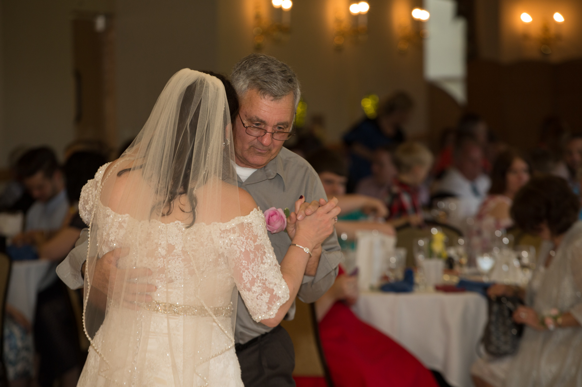 As for the images I got, I did use a flash for most of the evening. I moved around a bit more than some of the other posts I have made, since this time I was not parked behind a DJ table shooting. There was a lot of ambient lighting when the wedding party first arrived. I was pretty far away for the toasts and cake cutting so I cranked up the ISO to compensate for not having a flash or other light source near by. In doing so it really blew out the light coming in from the outside, but made for good lighting on the subjects inside.